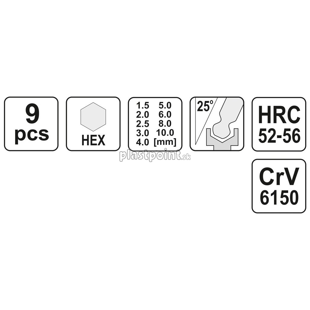 Sada 9 ks dlhších imbusových kľúčov bežných rozmerov s guľôčkou, uložených v prehľadnom, plastovom držiaku.