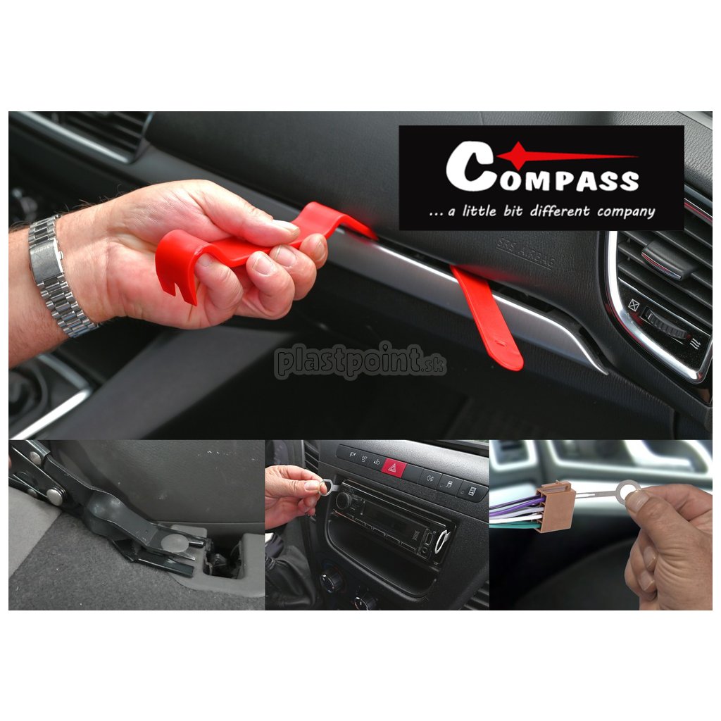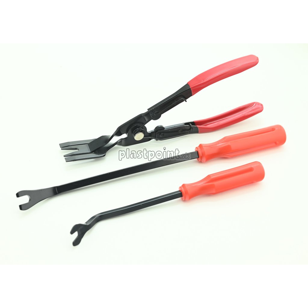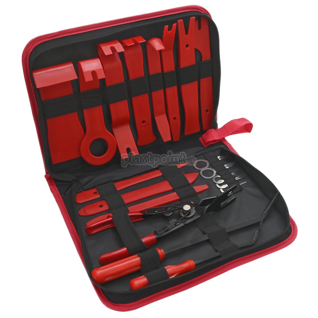 Obsahuje 11 kusov pružných nylonových sťahovákov a páčidiel, navrhnutých pre bezpečné rozoberanie interiéru bez poškodenia povrchov. Súčasťou sady sú tiež kliešte a dve páčidlá (15 a 20 cm) na odstránenie spôn, 2 planžety na demontáž autorádia a 3 vypichováky na piny konektorov.