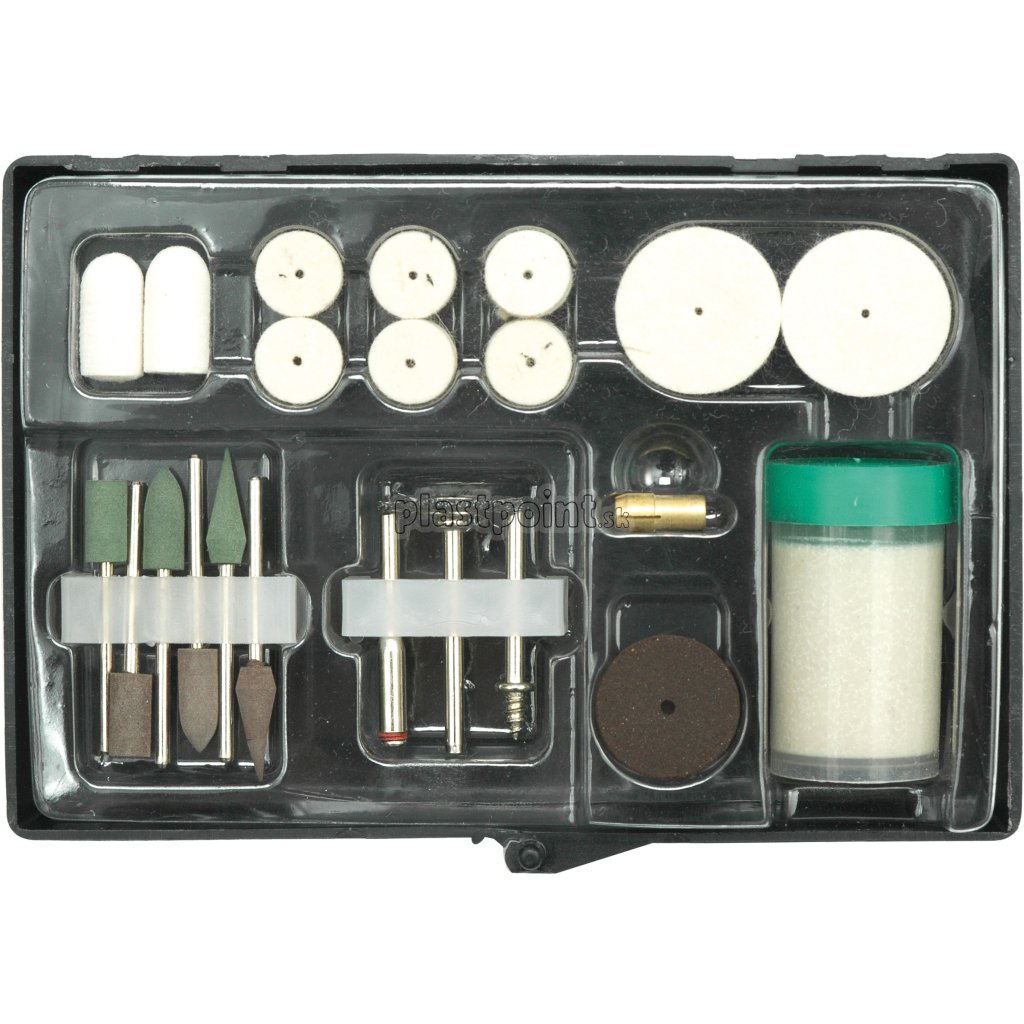 Sada 22 ks doplnkov na doplnenie základného vybavenia rovnej brúsky. Umožňuje rýchlu, ľahkú a hospodárnu prácu. Príslušenstvo umožňuje presné spracovanie malých prvkov. Vhodné pre brúsky s otvorom nástroja 3,2 mm.