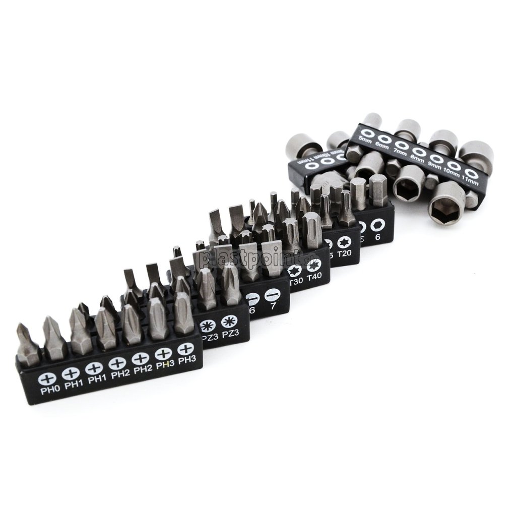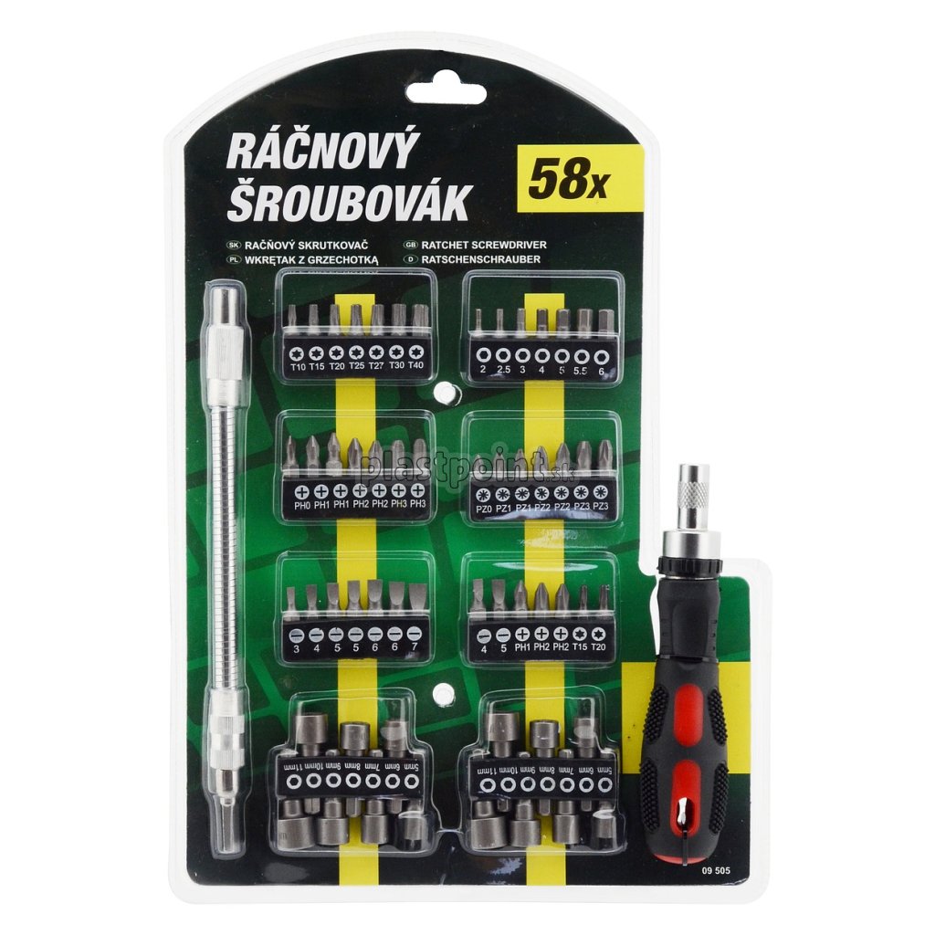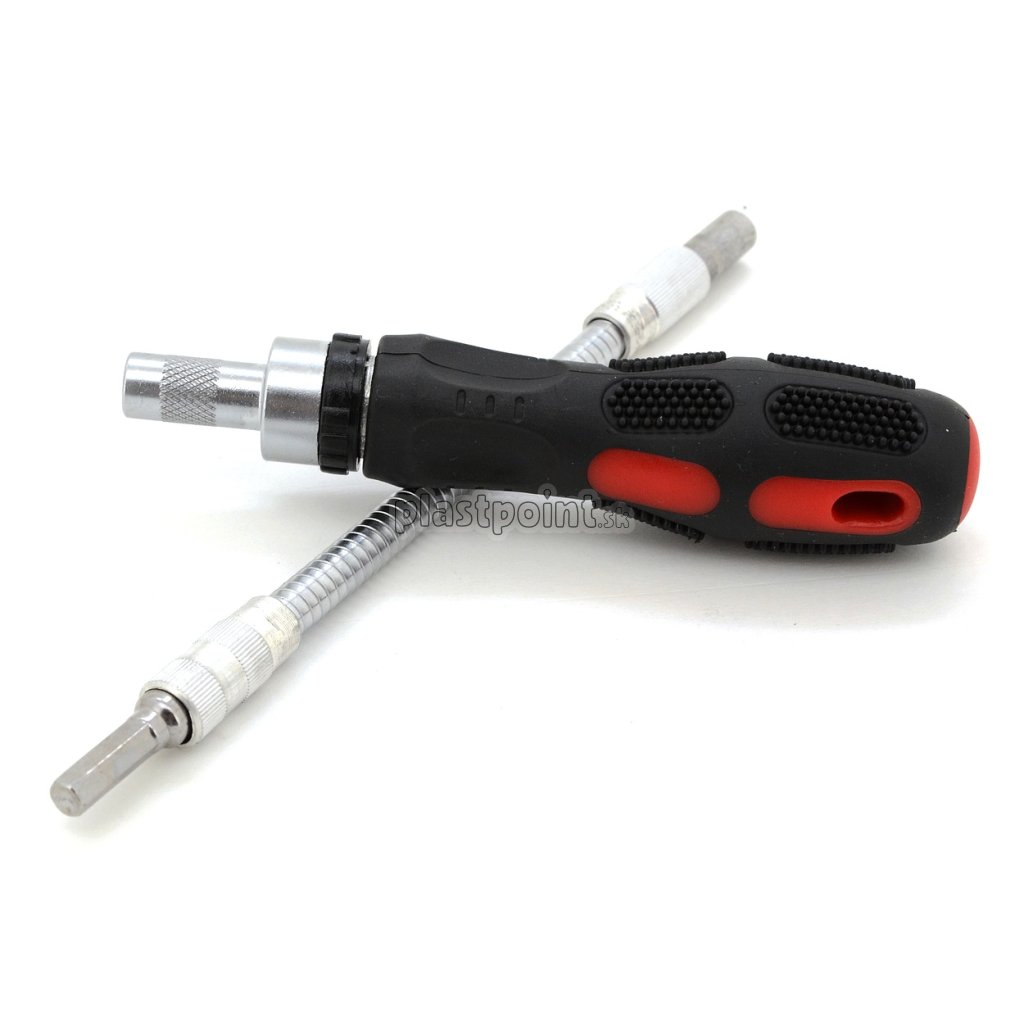 Sada račňového skrutkovača s ohybným nástavcom a celým radom bitov. Najpoužívanejšie bity sú v balení viackrát.