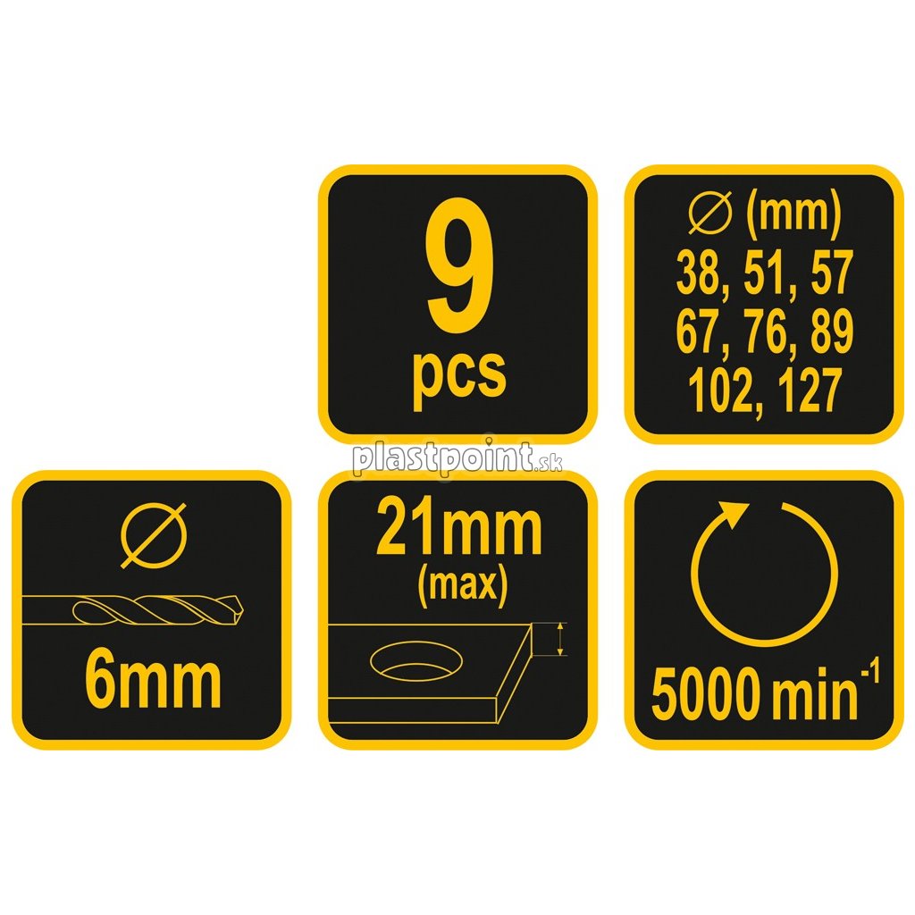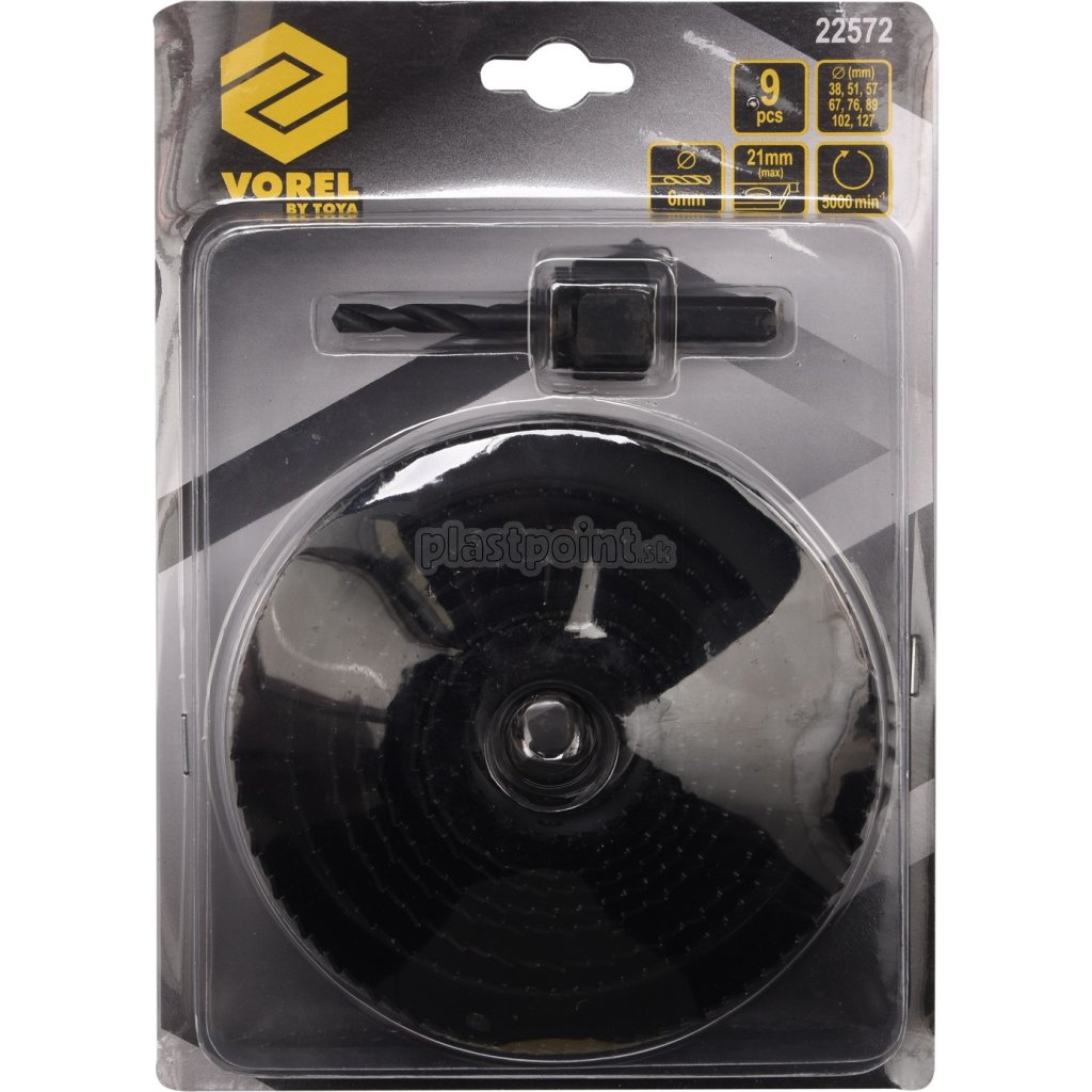 Miskové vrtáky na vyrezávanie otvorov do dreva, plastov, sadrokartónu, Ytongu (pórobetónu) a podobne. Súprava obsahuje 8 priemerov vyrezávačov a upínací tŕň s vodiacim stredovým vrtákom. 51; 57; 67; 76; 89; 102; 127mm