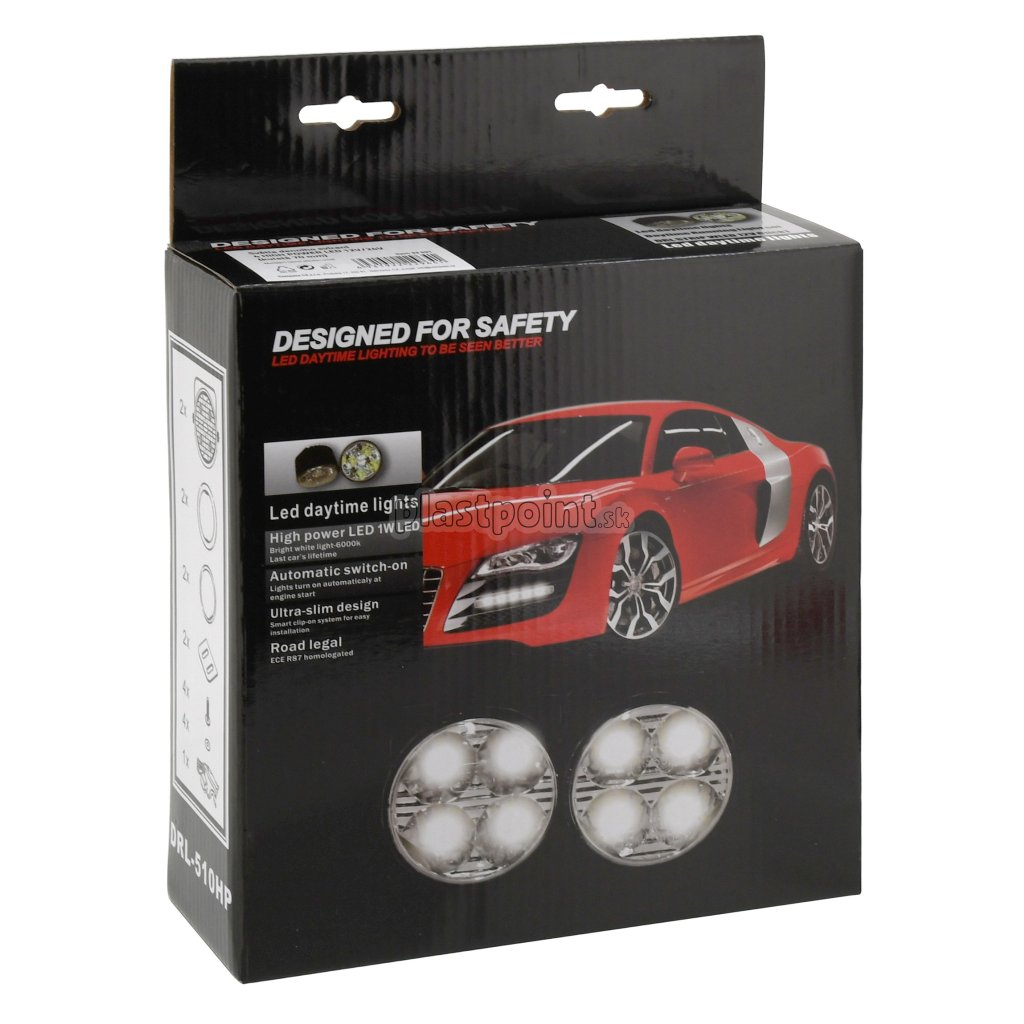 Homologované svetlá pre denné svietenie, napájanie 12/24 V. Každé svetlo je osadené 4x vysoko svietivou HI POWER LED diódou.
