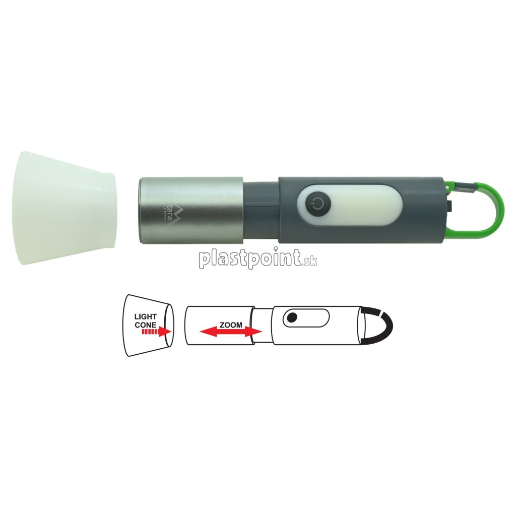 Svietidlo je vybavené hlavnou vysoko svietivou 10W LED vybavenou reflektorom, ktorý v kombinácii so sklenenou šošovkou vydáva vysoký optický výkon. Čelné svietenie je opatrené funkciou ZOOM, kedy vyžarovaný lúč svetla je plynule regulovateľný povysunutím hlavy. Svietidlo je na boku doplnená SMD 2835 LED pre rozptýlené osvetlenie.