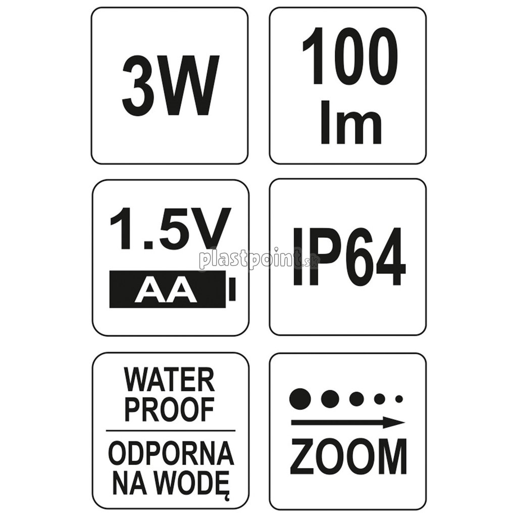 Svietidlo vreckové vodeodolné IP64, fce ZOOM, 110lm, 1xAA, 100x25mm