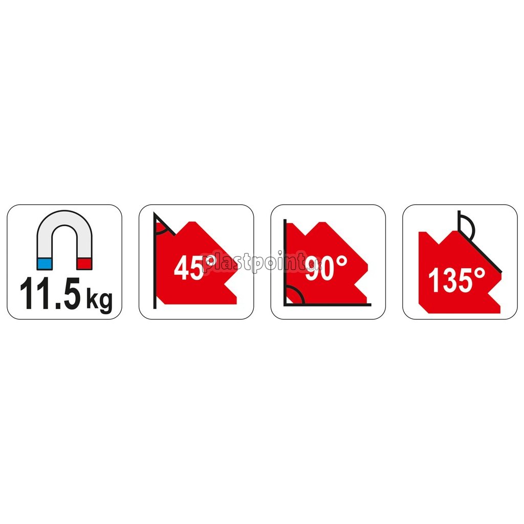 Umožňuje presné spájanie materiálov v uhloch 45°, 90° a 135°. Nosnosť magnetu cca 11,5 kg. Povrchová úprava červené práškové lakovanie.