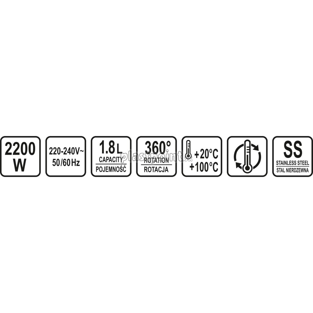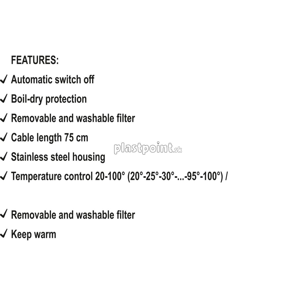 Príkon 1850-2200W zaistí rýchle ohriatie 1,8l vody na prednastavenú teplotu, ktorú je možné ľahko navoliť pomocou ovládacieho panela. Ďalšou výbavou kanvice je funkcia vybrať a umyť. Zariadenie je napájané pomocou 75 cm dlhého kábla na 230V.