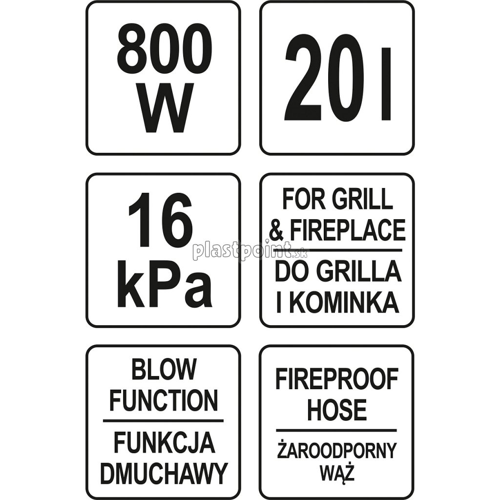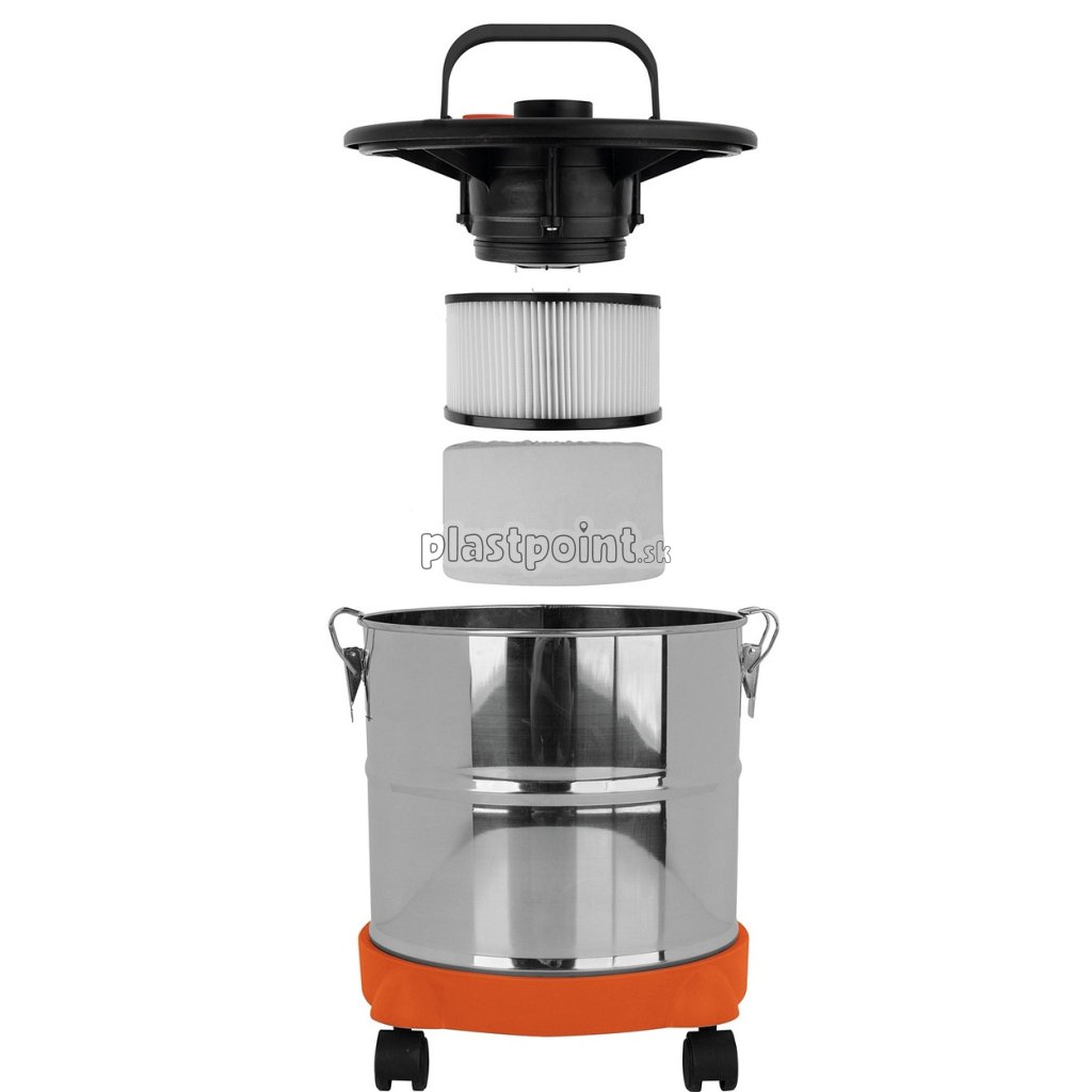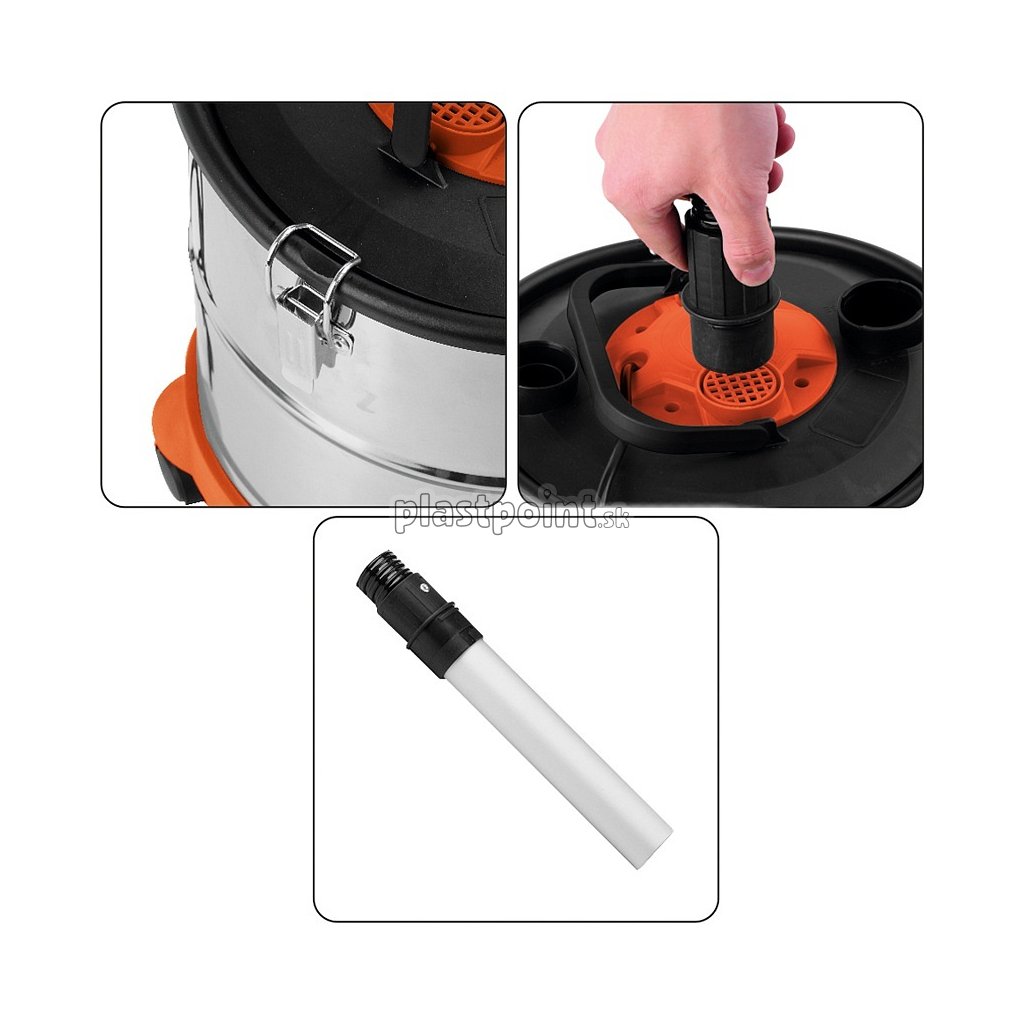 Sacia hadica je tepelne odolná a je zakončená hliníkovou sacou hubiou. Nádoba na popol je vyrobená z nehrdzavejúcej ocele a jej objem je 20 litrov.