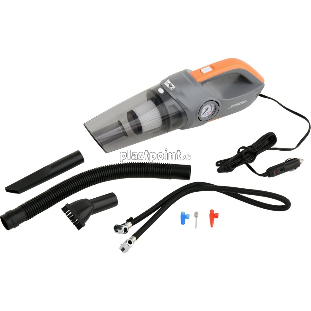 Prenosný vysávač s funkciou kompresora, s dlhým káblom so zástrčkou do zásuvky automobilového zapaľovača 12V.
