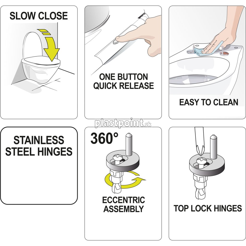 WC doštička so spomaľovacím sklápacím mechanizmom, zaisťuje tiché a voľné dosadnutie dosky k mise.