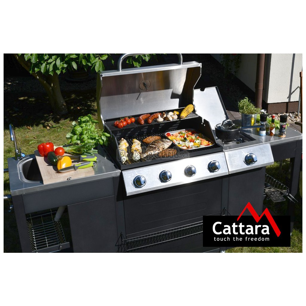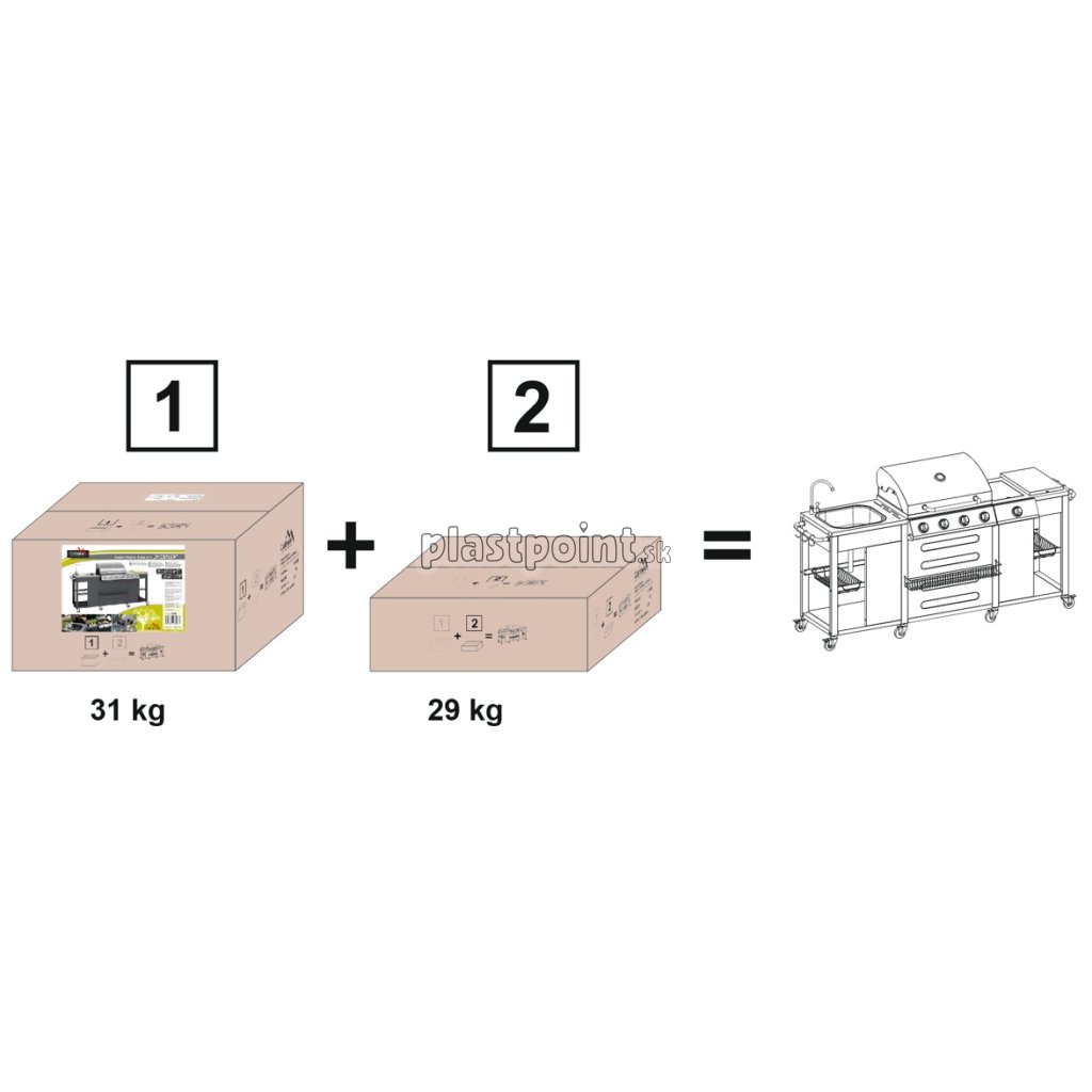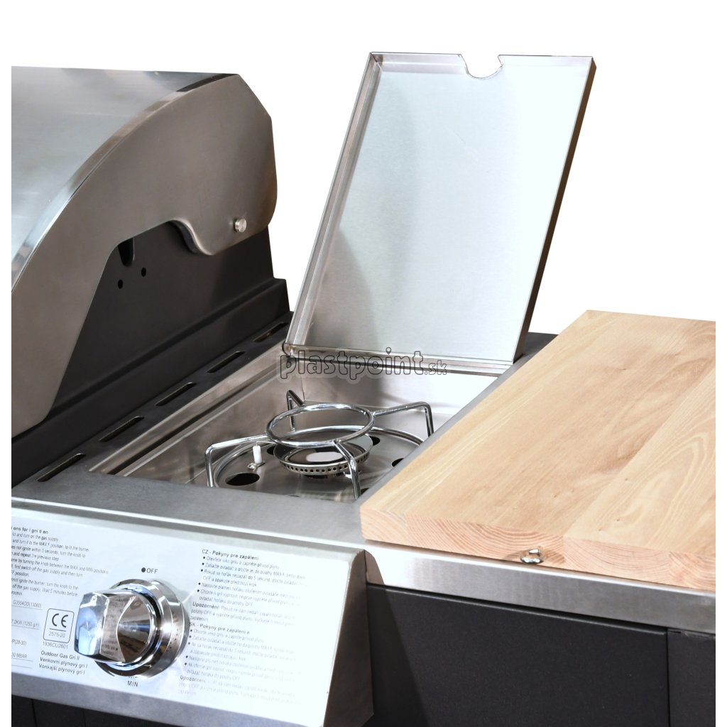 Hlavný grilovací priestor je osadený 4x horákmi so samostatnou reguláciou a piezo zapaľovaním. Vďaka možnosti vypnúť prostredné horáky je gril vhodný ako na priame, tak na nepriame grilovanie, je vybavený teplomerom a odkladacím roštom na udržiavanie teplôt už hotových pokrmov. Celá záhradná kuchyňa je doplnená varičom so samostatnou reguláciou a piezo zapaľovaním. Súčasťou je aj spojovacia hadica k plynovej fľaši a redukčný ventil.