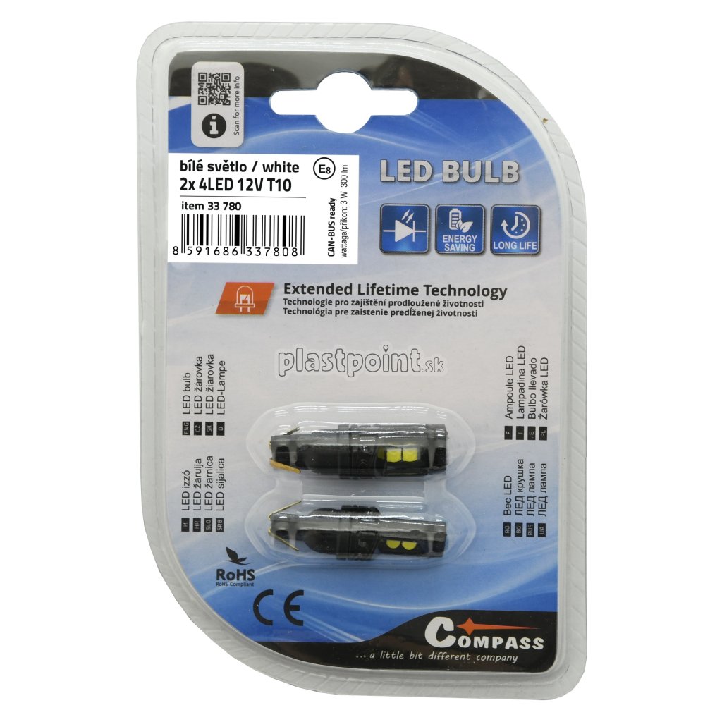 Žiarovka 4LED 3030 12V T10 s rezistorom CAN-BUS ready biela 2ks