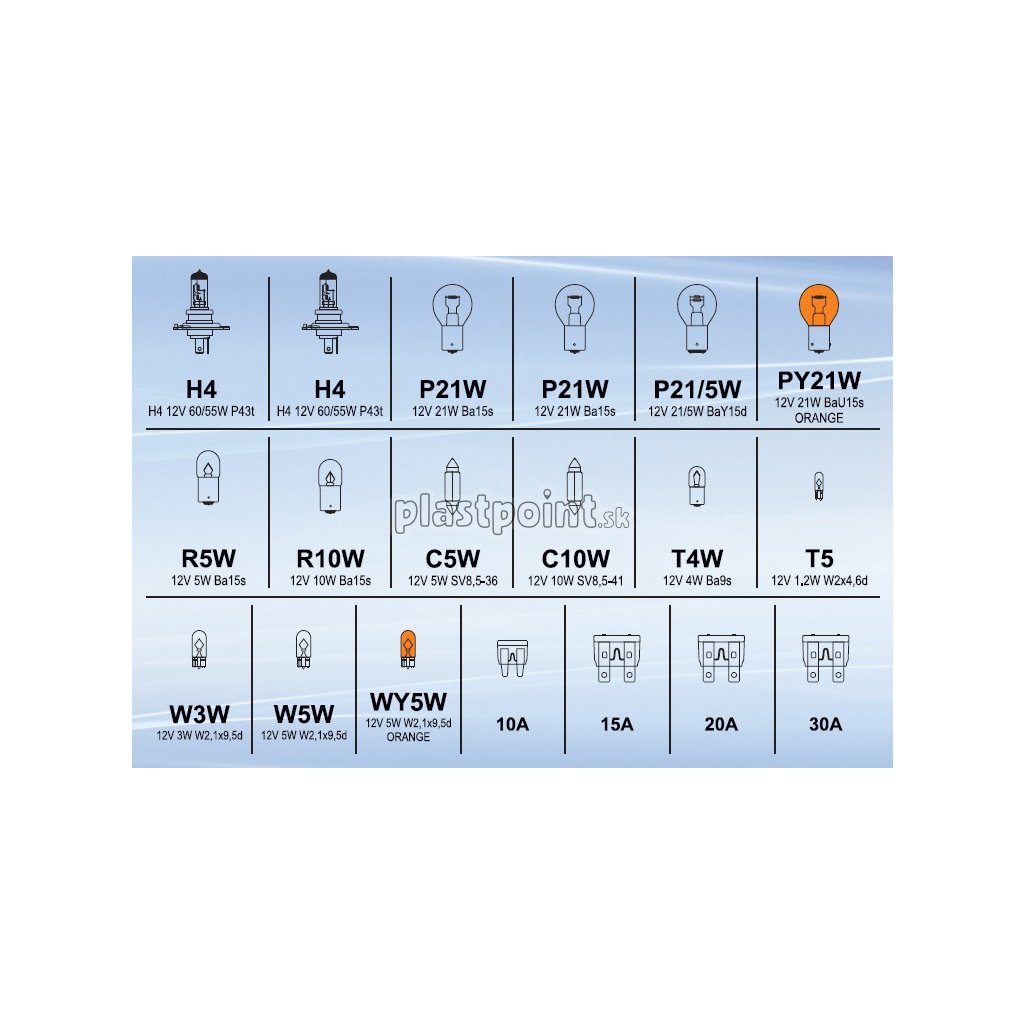 Uzatvárateľný kufrík so sadou náhradných žiaroviek 12V a poistiek, homologácia E.