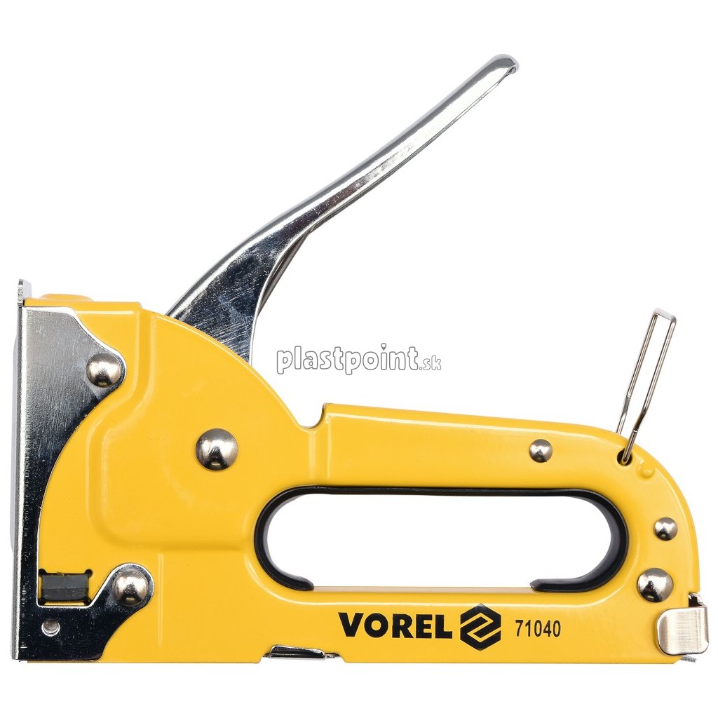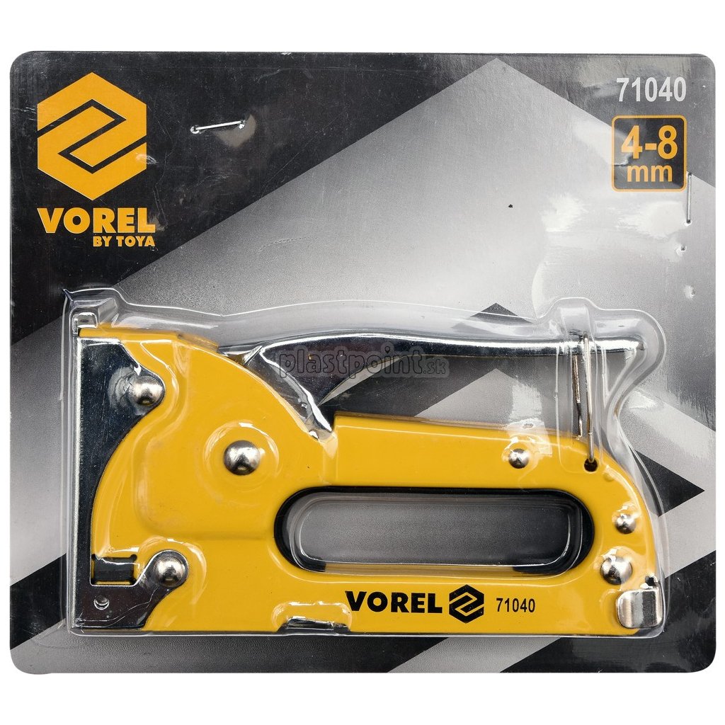 Kovová sponkovačka Vorel 71040. Je možné použiť spony dĺžky v rozmedzí 4 - 8 mm.